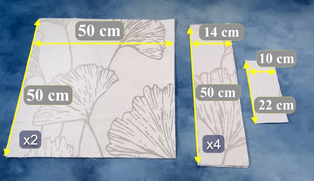 Для пошива мягкой сидушки потребуется два отреза ткани размером 50 см на 50 см, 4 отреза ткани размером 50 см на 14 см и отрез ткани размером 22 см на 10 см.