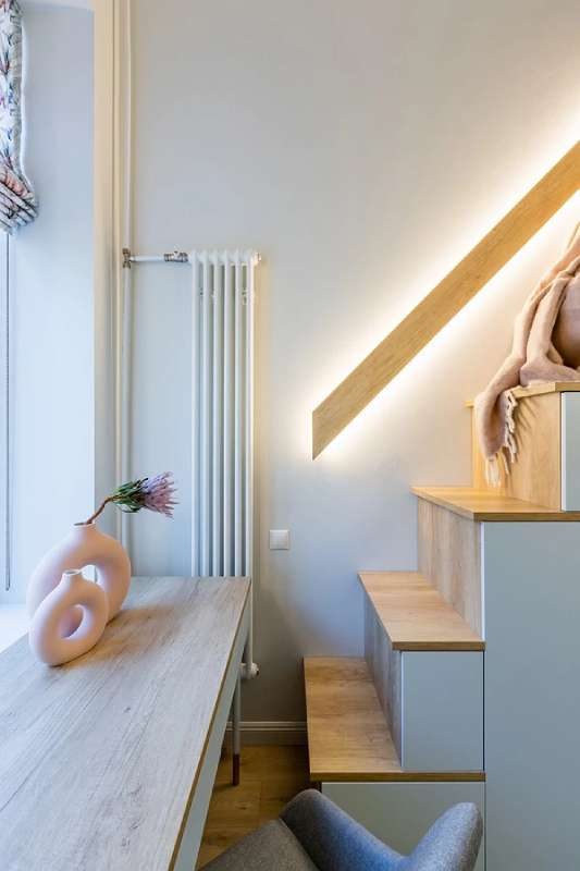 Чтобы где-то хранить вещи в столь ограниченном пространстве, дизайнеру пришлось идти на всевозможные хитрости. Например, когда она разделяла комнату на 2 этажа, то предусмотрела, что лестница будет заодно служить и «шкафом» — сюда сразу были встроены ящики для хранения. Конечно же, такую мебель пришлось делать на заказ, но результат того стоил!