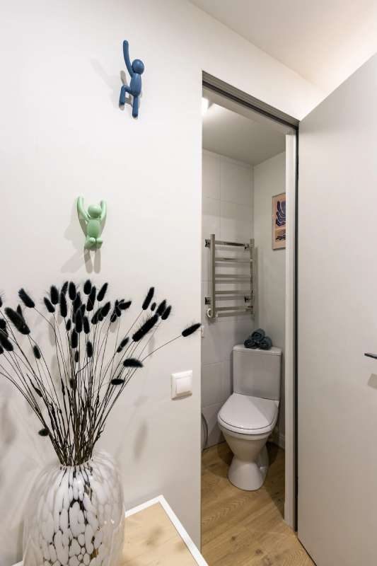 Особый интерес вызывает прихожая и санузел рядом. В мини-прихожую вместили обувницу и установили настенные крючки для одежды. За зеркалом есть даже скрытый мини-шкафчик, в котором спрятана гладильная доска.