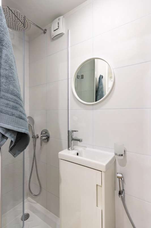 Санузел — просто высший пилотаж дизайнерской хитрости! Трудно поверить, но его уместили всего на 1,4 кв. м. Здесь стоит 70*70 см душевая, супер-компактная раковина с тумбой, а также унитаз углом. Да, места здесь маловато, но есть всё, что нужно!
