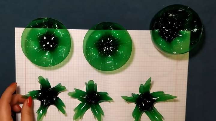 У трех донышек от 0,5 л бутылок сделайте разрезы по впалой части дна, также закруглите лепестки. Затем свечой/зажигалкой прогрейте лепестки и подверните их к центру. Каждое из трёх маленьких донышек, с помощью нагрева, постепенно «закрывается» всё сильнее, как у настоящей розы.