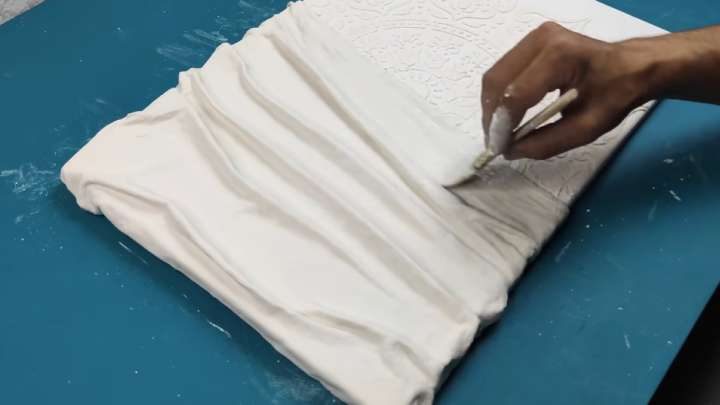 Расправить складки и сгладить их, смочив кисть водой и проведя ею несколько раз по ткани. Затем, на вторую половину холста положить трафарет и поверх нанести пасту для моделирования.