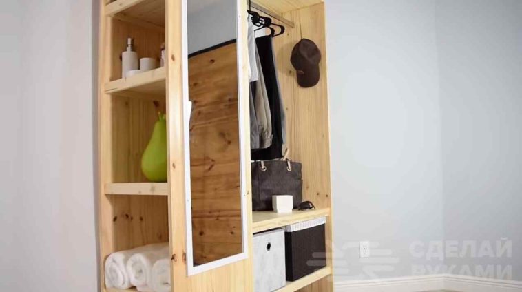 Подробно о том, как сделать своими руками мобильный шкаф для прихожей из мебельных щитов, можно посмотреть в видеоролике на сайте.