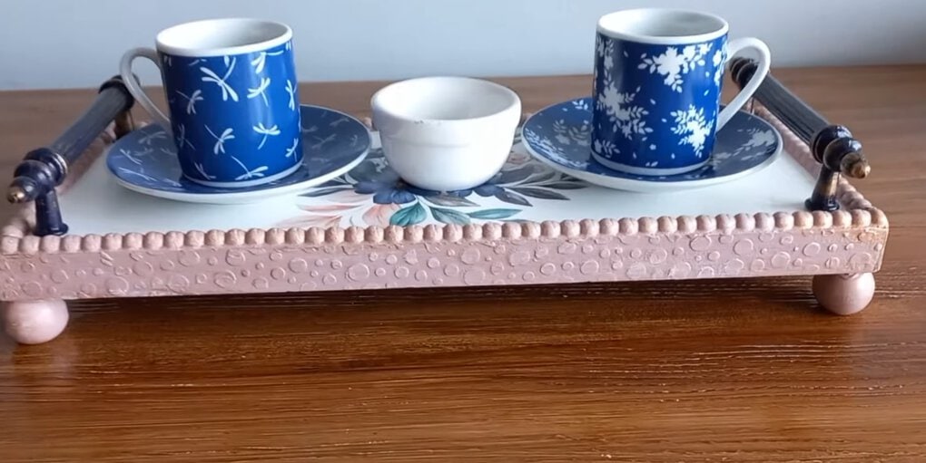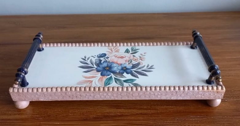 Для завершения работы покройте поднос слоем акрилового лака и оставьте до полного высыхания.