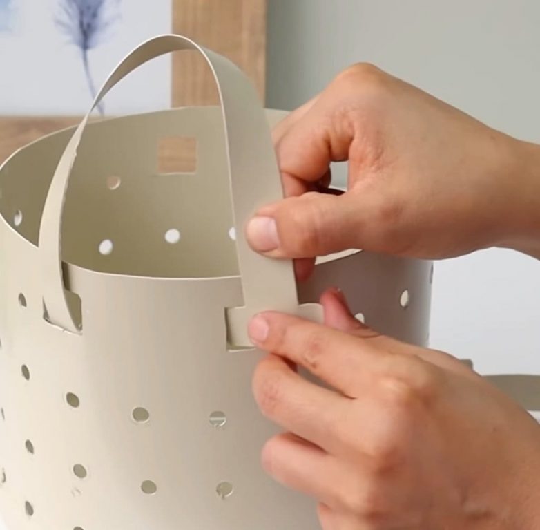 Разрежьте ободок на 2 равных части, и вырежьте ручки. Покрасьте ручки и после полного высыхания закрепите их на корзине, в которой заранее были проделаны квадратные отверстия для крепления.