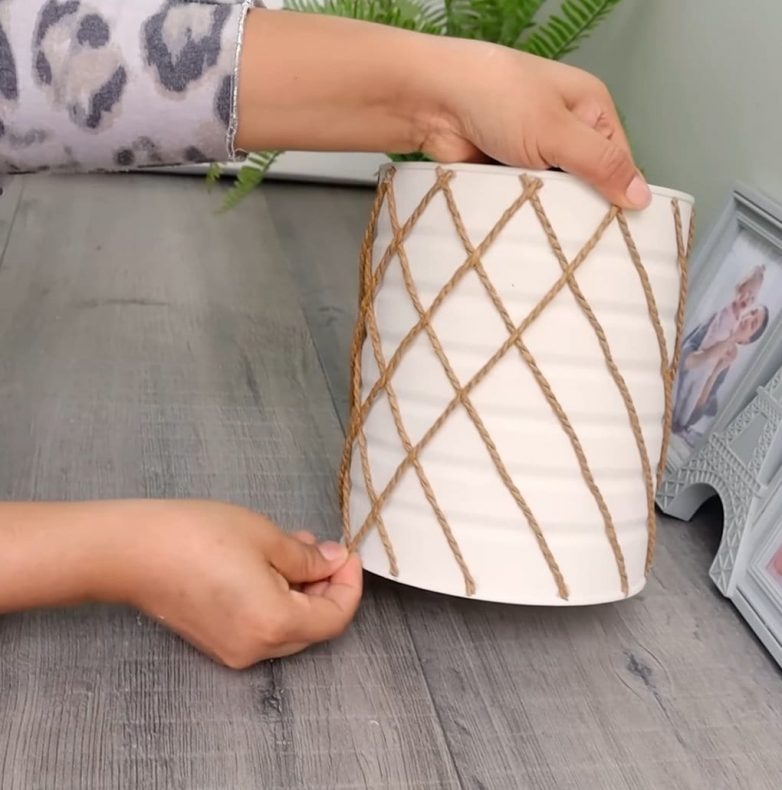 Нижнюю и верхнюю часть емкости оформите косичкой из шнура.