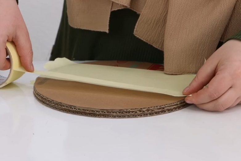 Для изготовления крышки корзины сделайте три круглых заготовки из плотного картона, склейте их между собой и обклейте бумажным скотчем.