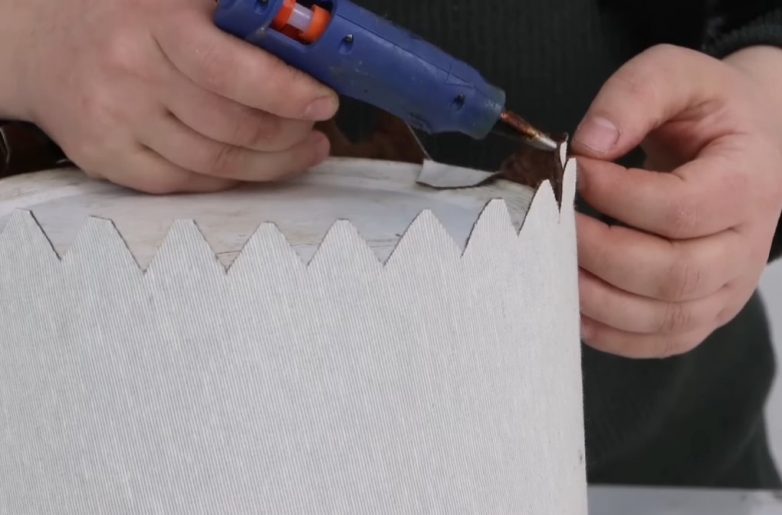 Чтобы аккуратно обклеить дно, сделайте на ткани треугольные вырезы и зафиксируйте ткань с помощью горячего клея.