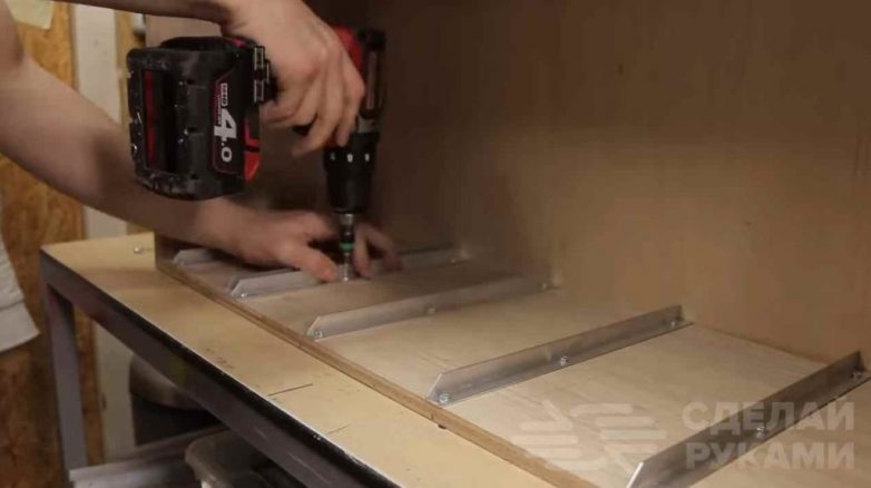 Разрезаем алюминиевый уголок на необходимые отрезки и устанавливаем на боковые стенки саморезами. Ту же процедуру повторяем ещё с тремя ящиками.