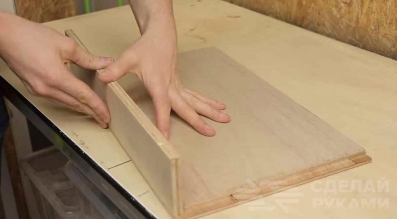 Для этого выбираем каждый край на толщину стенки и на половину глубины доски. Собираем боковые и заднюю стенку вместе и склеиваем на столярный клей.