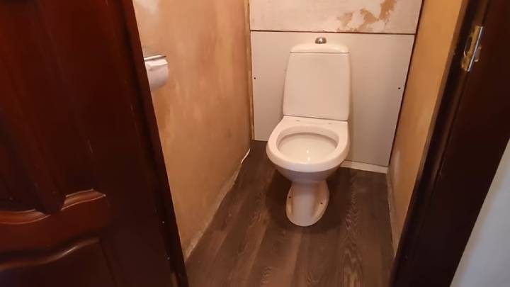 Поэтому её следовало заменить новой внешней панелью. Унитаз демонтировали, старые обои сняли.