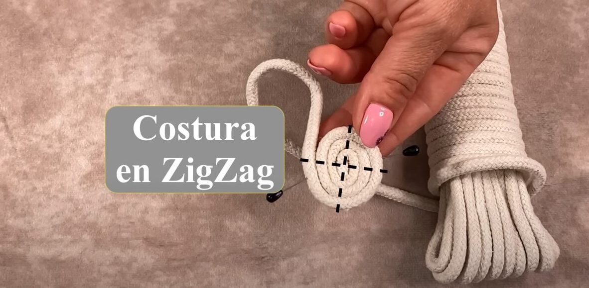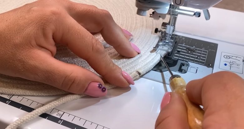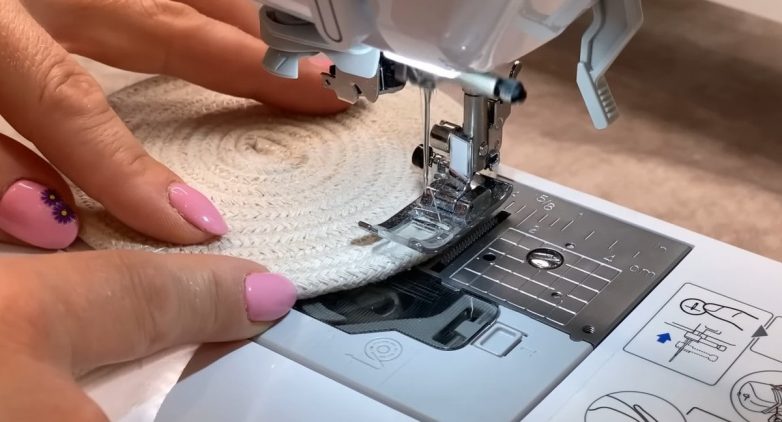 Перед началом работы укрепите конец шнура кусочком скотча. Сделайте 3-4 витка шнура, закрепите заготовку иголками и проложите машинную строчку швом зигзаг, соединяя витки друг с другом.