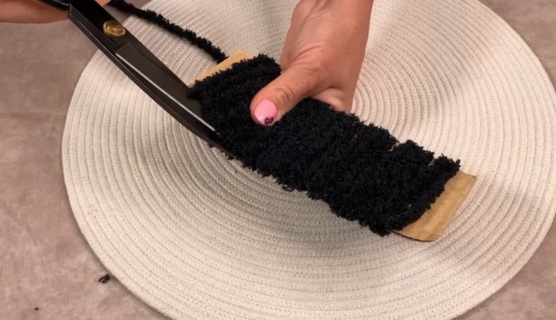 Для того чтобы ускорить процесс изготовления декоративной бахромы можно использовать картонную заготовку шириной 7 см. Просто обмотайте пряжу вокруг заготовки, а затем разрежьте ее, в результате получится большое количество отрезков необходимой длины.
