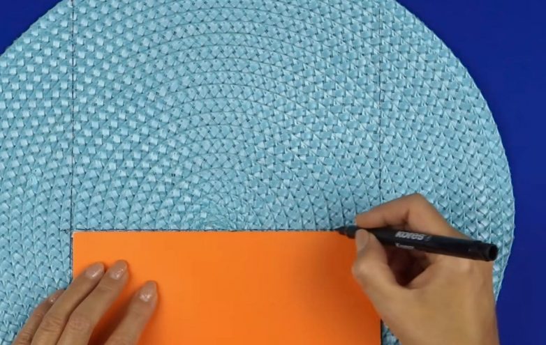 Для удобства изготовления сумки потребуется прямоугольный шаблон формата А4. Приложите шаблон к салфетке и обведите его, отмечая середину заготовки.