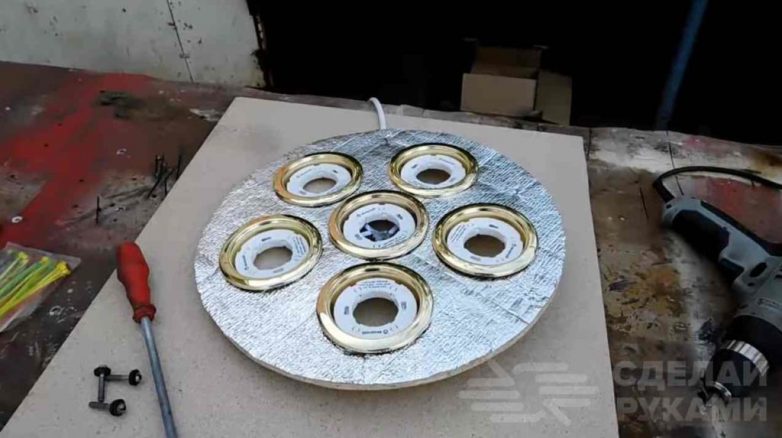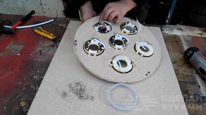 В вырезанные в круге отверстия автор устанавливает патроны под точечные светильники и производит их параллельное подключение.