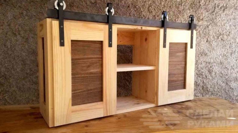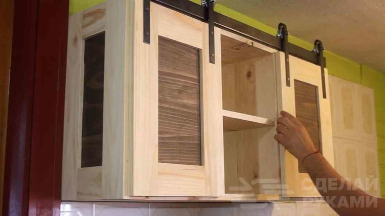 Подробнее о том, как своими руками изготовить навесной шкафчик с раздвижными дверцами, рекомендуем посмотреть в видеоролике на сайте.
