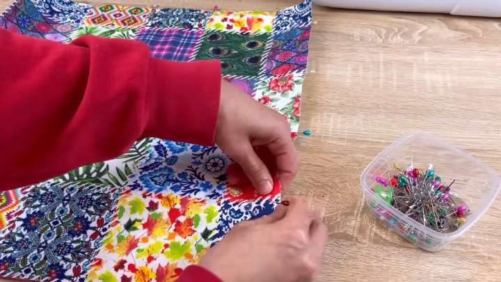 Отрежьте от утеплителя кусок 45*45 см. К нефольгированной стороне закрепите ткань булавками. Прошейте по краям на машинке.