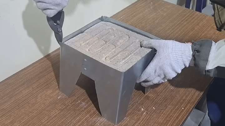 Согните в форме подставки, закрепите края. Установите внутрь два кирпича, обогните краями жестянки.