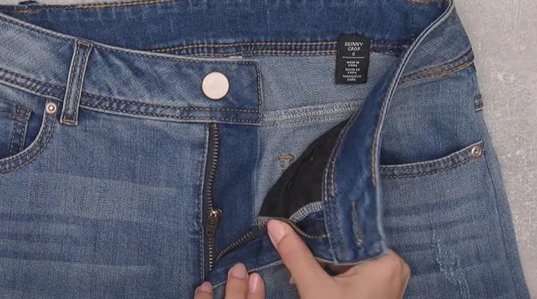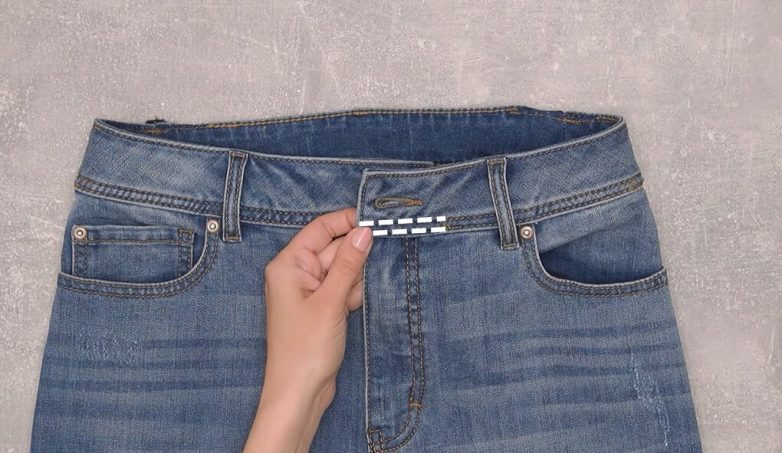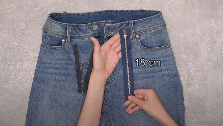 Подпорите пояс и отстрочку на джинсах и выпорите сломанную молнию.