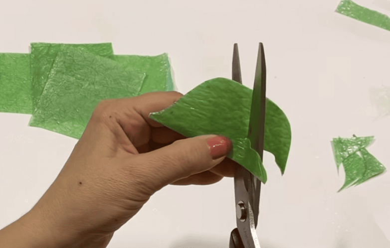 Нарезаем лист пластика на прямоугольники, затем сгибаем заготовки и вырезаем листочки.