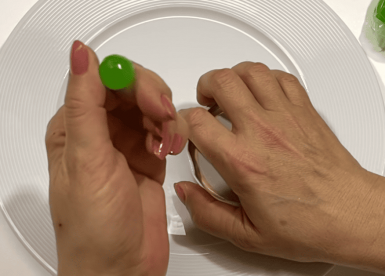 Придаем каждому кубику округлую форму. Для того чтобы сгладить шероховатости и отполировать поверхность используем тарелку с плоским дном и еврокрышку. Кладем шарик на тарелку, а затем накрываем крышкой, слегка придавливая, и начинаем катать.