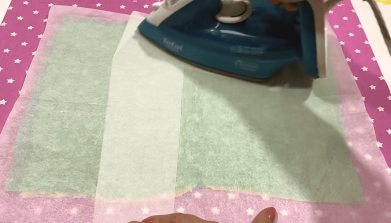 Убедившись в том, что слои слиплись между собой, аккуратно отсоединяем целлофан от пергаментной бумаги. Переворачиваем так, чтобы более прогретая сторона оказалась снизу. Снова накрываем пергаментом и еще раз проглаживаем.