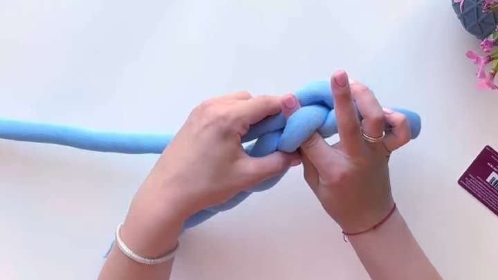 Когда длина ручки будет достаточной, хвостик протяните через крайнюю петлю с противоположной стороны. Затем выведите его через воздушную петлю ручки вовнутрь, зафиксируйте на боковой петле сумки.