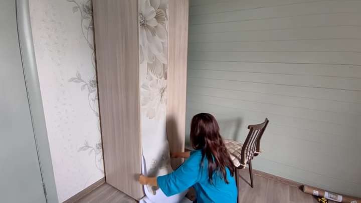 На обезжиренную, чистую, сухую поверхность шкафа ровно приклейте плёнку.
