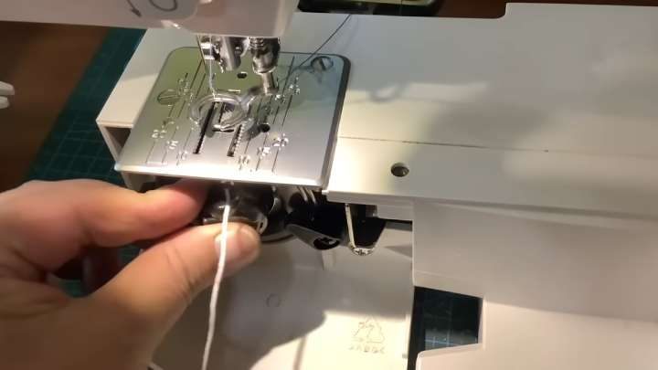 На шпульку для швейной машинки намотайте нитки для вышивания. Вставьте в шпульный колпачок, установите в машинку.