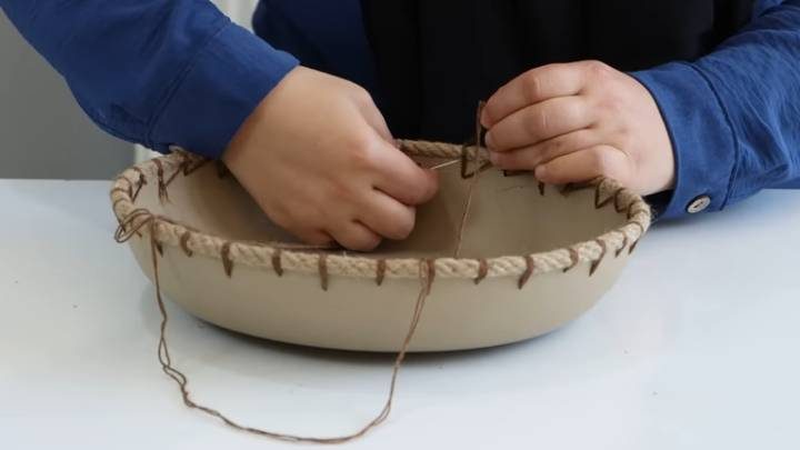 Толстыми нитками (можно для вышивания) прошейте сковородку через ранее проделанные отверстия, закрепляя верёвку. Затем добавьте ещё уровень верёвки, вновь закрепите нитками, и, таким образом, постепенно нарастите высоту.
