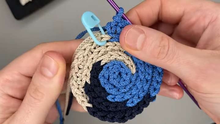 Когда вы по схеме третьего ряда провязали 5 СБН баклажанным цветом, перейдите на лазурный. Вы заметите, что по узору круга в предыдущем ряду тоже идёт лазурный цвет. Провяжите по лазурному цвету столько столбиков, сколько есть в предыдущем ряду. Когда дойдёте до конца, где идёт смена цвета, провяжите дополнительно ещё 3 СБН, и только потом поменяйте цвет на следующий (бежевый). Таким образом, и получается эффект «волны»: когда при смене цвета в предыдущем ряду вы дополнительно провязываете 3 столбика в новом.
