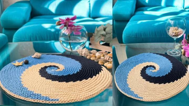 Свяжите коврик или салфетку интересным узором «Верблюд», который, благодаря смене цветов, напоминает бушующие волны. Вязание крючком несложное, но требует концентрации, чтобы узор получился ровным.