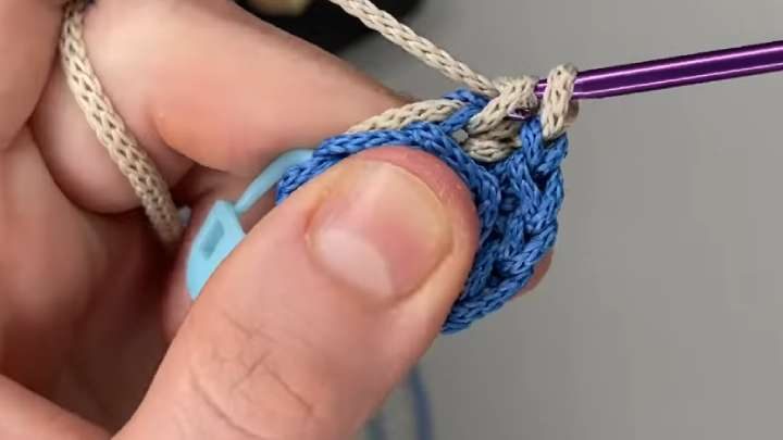 Третий ряд — увеличение СБН через одну петлю (1+2+1+2+1…). Провяжите первую петлю третьего ряда бежевым цветом, поставьте в неё маркер. Таким образом, всего получилось провязать 5 СБН бежевым цветом. Теперь присоедините к вязанию баклажанный цвет и провяжите следующие 5 СБН по ряду, где увеличение идёт уже через одну петлю (2+1+2). Пока вяжете каким-то из трёх цветов, два других цвета остаются сзади, а вы их как бы обвязываете и потом меняете нить на нужный цвет.