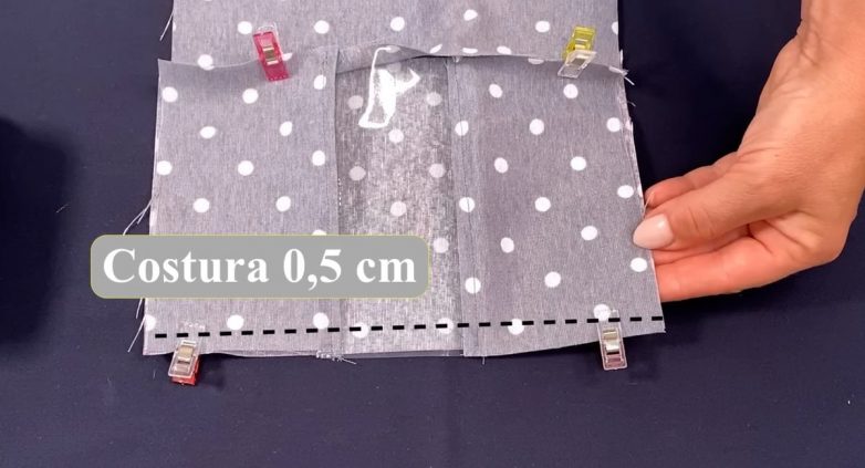 Сложите два маленьких отреза ткани и отрез винила лицевыми сторонами друг к другу и проложите фиксирующие строчки на расстоянии 0,5 см от края.