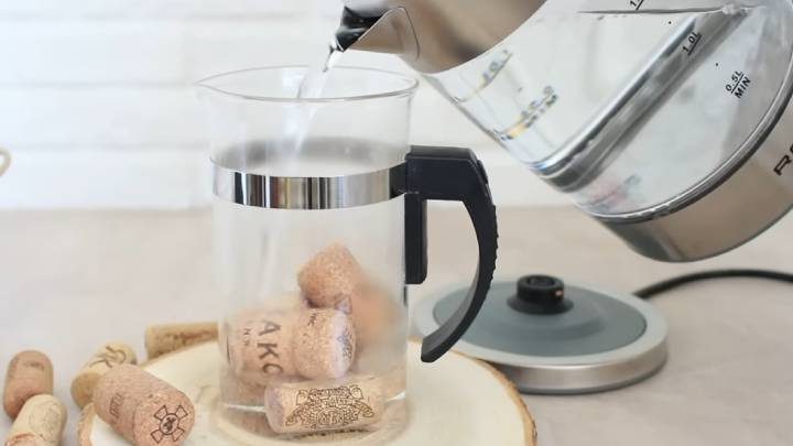 Чтобы выровнять пробки, их нужно залить кипятком (пробки должны быть полностью погружены в воду), оставьте до полного остывания воды.