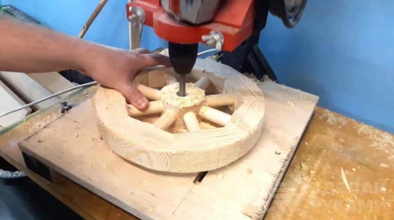 Далее в каждой центральной части колеса необходимо будет при помощи того же сверла Форстнера просверлить по восемь отверстий для деревянных спиц, напиленных из круглой палочки.