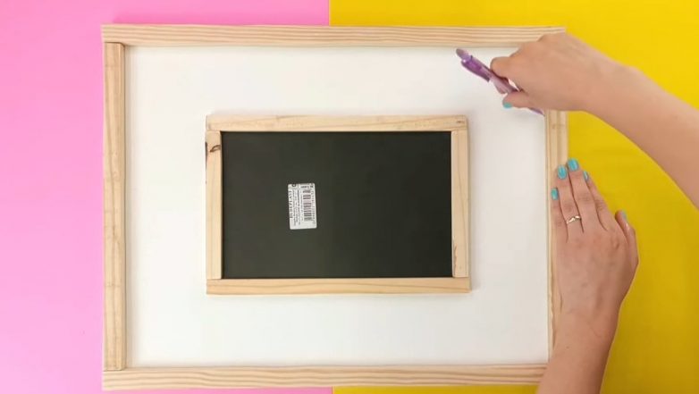 Используя деревянные рейки, сделайте разметку для рамы самого зеркала и для обрамления всей заготовки.
