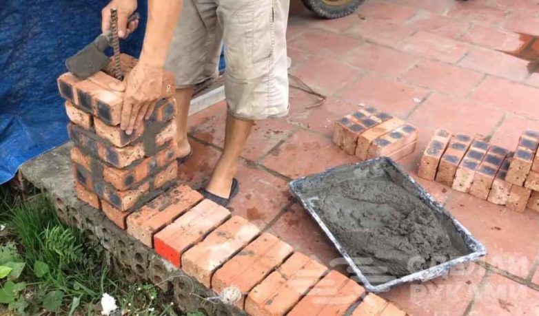 Далее мастер начинает «наращивать» столбики: каждый новый кирпич укладывается с небольшим смещением в сторону относительно предыдущего.