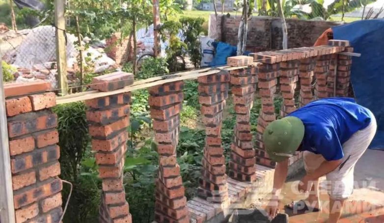 На последнем этапе останется только положить верхний ряд кирпича. Для этого автор укладывает сверху столбиков две дощечки. Но лучше использовать арматуру.