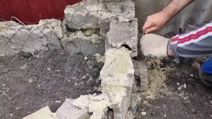 Распылите грунтовку для бетона. Затем тот же цементный раствор нанесите поверх сетки, чтобы полностью скрыть кирпичи.
