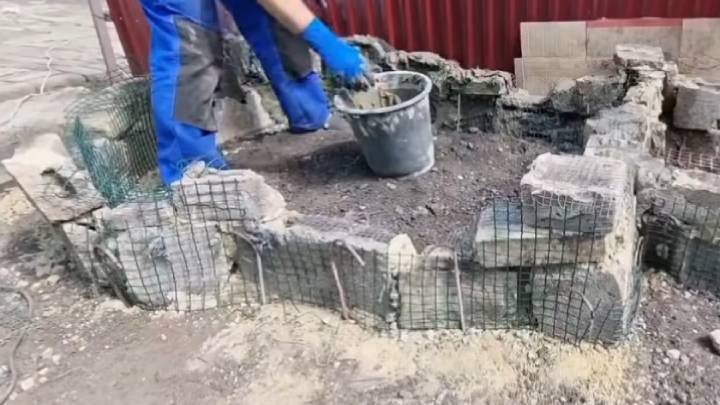 Соберите основание клумбы, промазывая кирпичи раствором.
