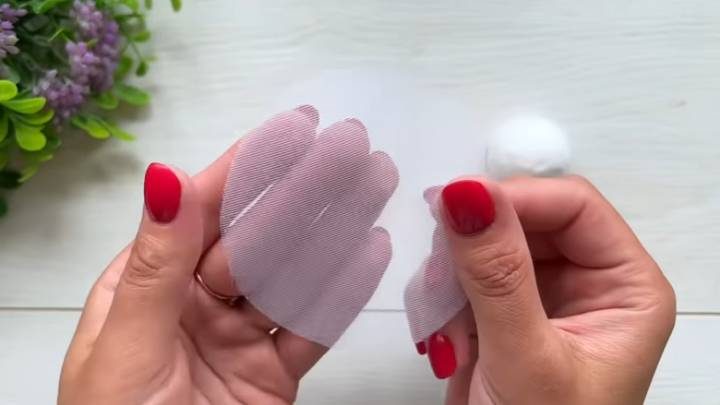 Для бантика понадобится пенопластовый шарик 3,5 см, разрезанный напополам. А также круг из любой полупрозрачной ткани 10 см диаметром.