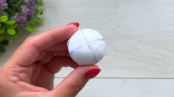 Соберите ткань иглой с ниткой по краю, обтяните половинку шарика. Сделайте разметку.