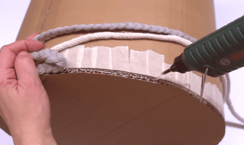 Чтобы получить более интересную фактуру, одновременно используем трикотажную косу и шнур. Оклейку начинаем с области донышка. Тщательно наносим клей по периметру и прокладываем косой нижний ряд. Параллельно, без отступа прокладываем следующий ряд, но уже веревочный.
