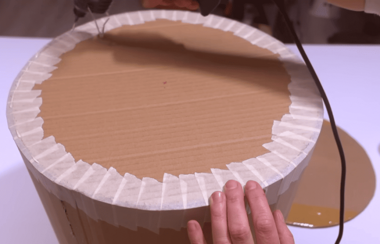 Вырезаем из картона 3 круглых заготовки. Вместо шаблона можно использовать основу. 2 заготовки станут донышком. Приклеиваем к основе первую заготовку, затем дополнительно проклеиваем место стыков по периметру молярным скотчем. После приклеиваем еще одну заготовку.