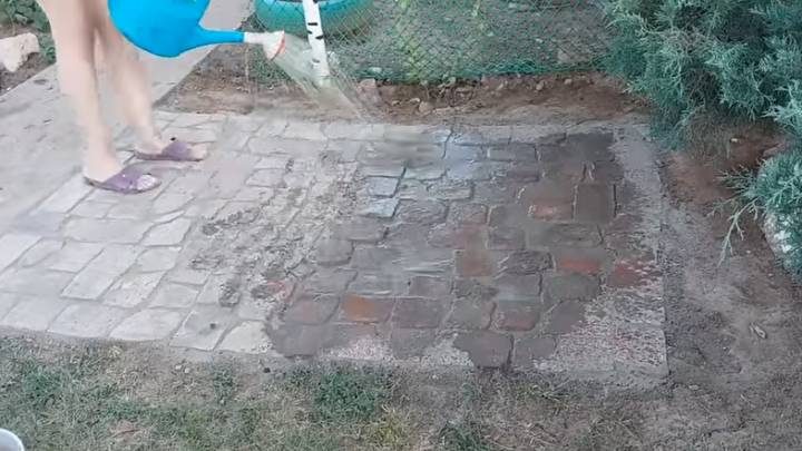 Цемент с песком смешайте 1:2, засыпьте сухую смесь в щели между кирпичами. Пролейте водой, оставьте на сутки-двое.