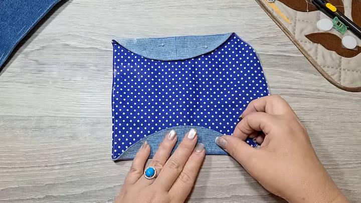 Теперь загнуть боковые части от прямого среза, снова прошить на машинке.