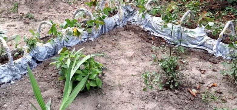 Если необходимо изменить направление клумбы, добавьте конструкцию из обрезанной на половину бутылки с отверстиями.