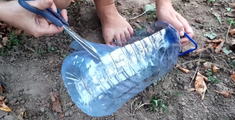 С одного бока бутылки вырежьте прямоугольное отверстие, необходимое для выхода лишней влаги. С другого бока бутылки вырежьте отверстие шириной 8-10 см.