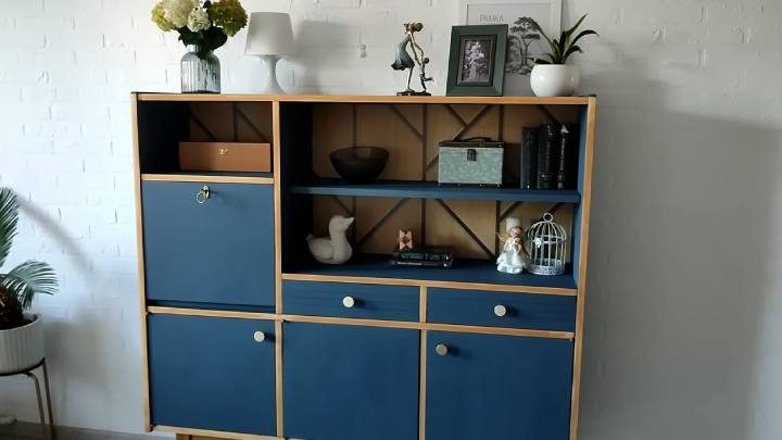 Покройте всё матовым лаком. По желанию можно также поменять у серванта ручки. Посмотрите, насколько по-новому смотрится советская мебель!